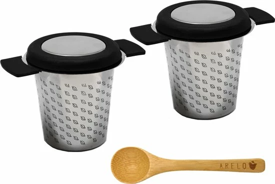 Dit is een set van twee luxe theezeefjes met een bamboe maatlepel. De luxe theezeefjes zijn gemaakt van roestvrij staal en ideaal voor het zetten van losse thee. De gaatjes in de theezeef zijn zo klein dat je bijna geen gruis in je theeglas krijgt. Op de deksel en de handvaten zit zwart siliconen, zodat je je handen niet brand bij het vasthouden van het zeefje of de deksel. De zeefjes passen in de meeste mokken, glazen, koppen en theepotten. De maatlepel is gemaakt van bamboehout. 1 flinke lepel losse thee is in de meeste gevallen genoeg voor 1 kopje thee.