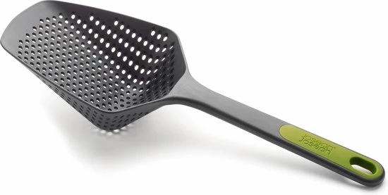 Joseph Joseph staat bekend om hun keukenproducten met mooi en slim design. De Joseph Joseph Elevate keukenhulpen, en ook deze Scoop vergietlepel, zijn zodanig ontworpen dat door een uitgekiend balanssysteem het werkdeel het keukenblad niet raakt. Bij het eten bereiden kun je de lepel of spatel rustig neerleggen zonder dat het werkblad vies wordt. Hierdoor werk je hygiΓ«nischer. Het gepatenteerde Elevate systeem is gegarandeerd hittebestendig tot 200 graden Celsius en daarom ideaal in combinatie met anti-aanbak-pannen. Alle onderdelen hebben een ergonomisch zacht handvat en kunnen in de afwasmachine.