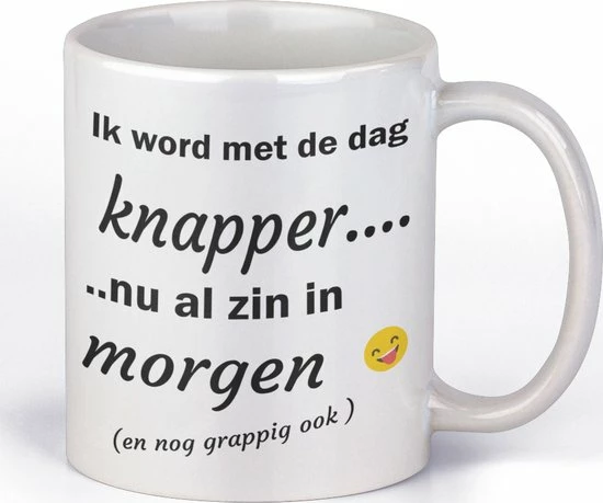 Grappige mok met de tekst: ik word met de dag knapper… nu al zin in morgen ( en nog grappig ook) met afbeelding smiley