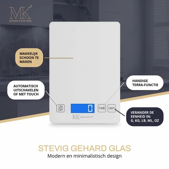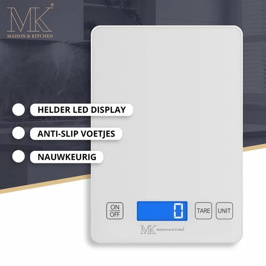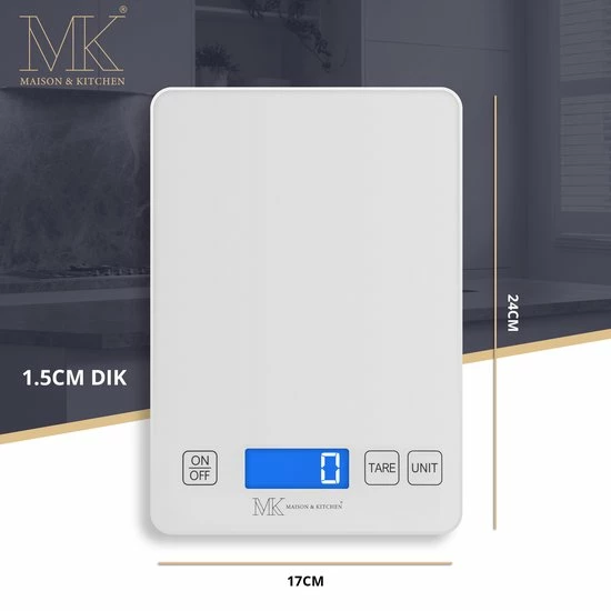 Hou jij van Koken? Weeg nauwkeurig het juiste aantal van uw favoriete recepten. Of het nu gram, ons, pond of milliliter is, MK weegschalen kunnen het! De keukenweegschaal is uitgerust met een gemakkelijk af te lezen LCD-display en tarrafunctie en schakelt automatisch uit na 2 minuten om de batterij te sparen. Een echte musthave voor iedere keuken!