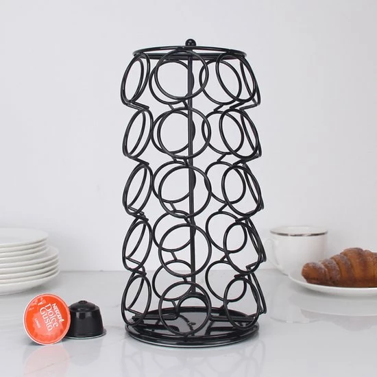 De capsulehouder is robuust gepoedercoat in de kleur glans zwart en geschikt voor 35 capsules van Dolce Gusto of vergelijkbare cups.