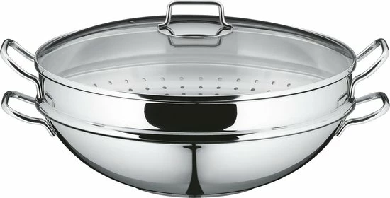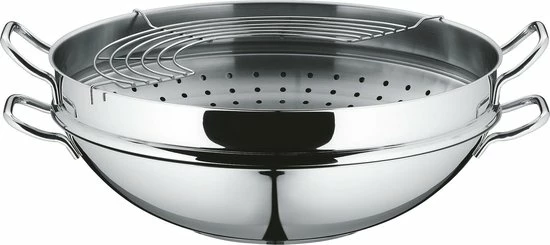 De Macao wokpan van WMF is een volledig roestvrij stalen pan die van alle gemakken voorzien is. De pan is geschikt voor alle warmtebronnen en daarnaast ook vaatwasmachinebestendig. De pan wordt geleverd inclusief inzetje en afdruiprekje.
